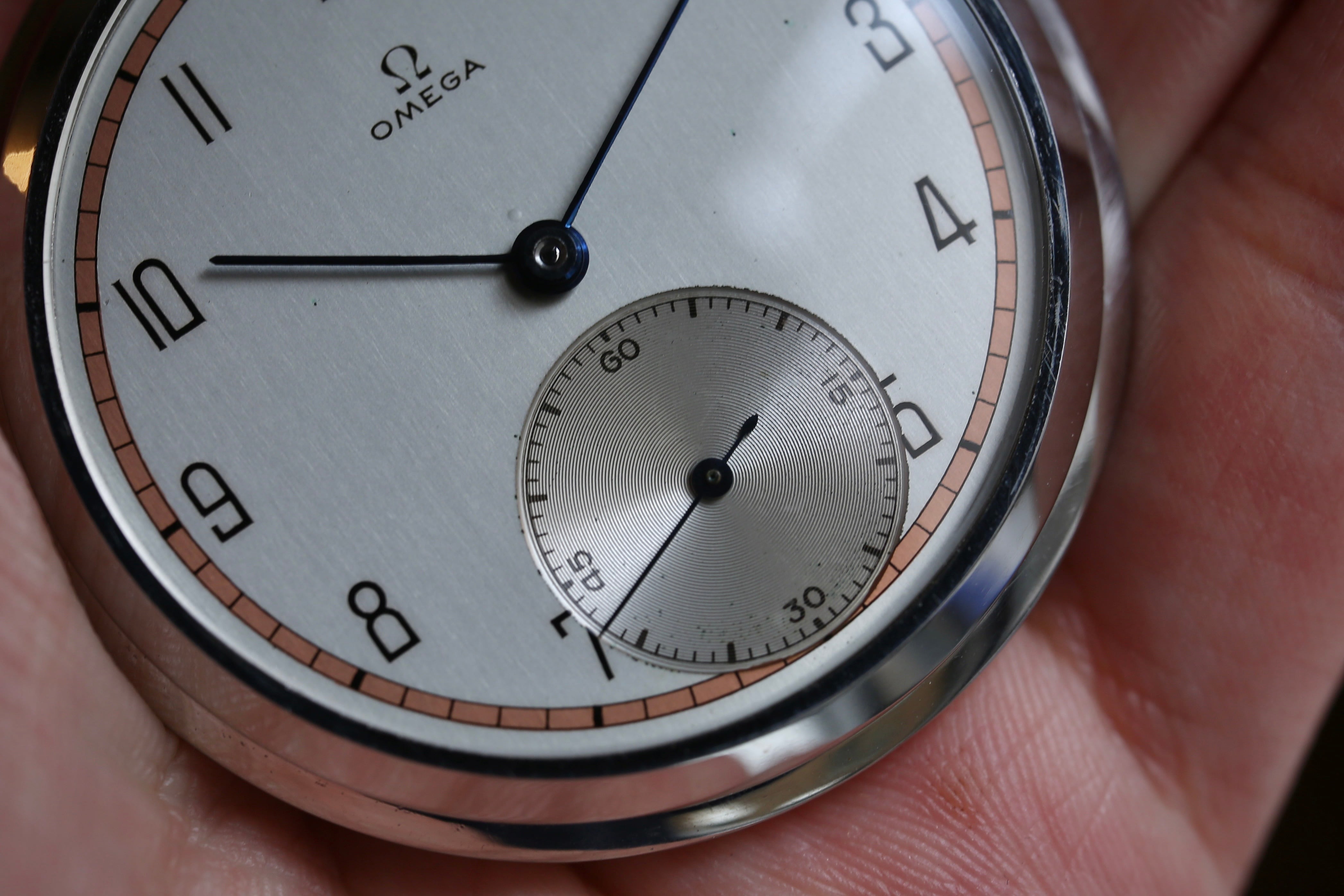 【OMEGA】1940年製 オメガ 懐中時計 『スイス・スタイル』 レッドカッパーダイヤル ブルースチール針 フルアラビア数字 OH済み / vintagewatch / pocket watch / hand winding