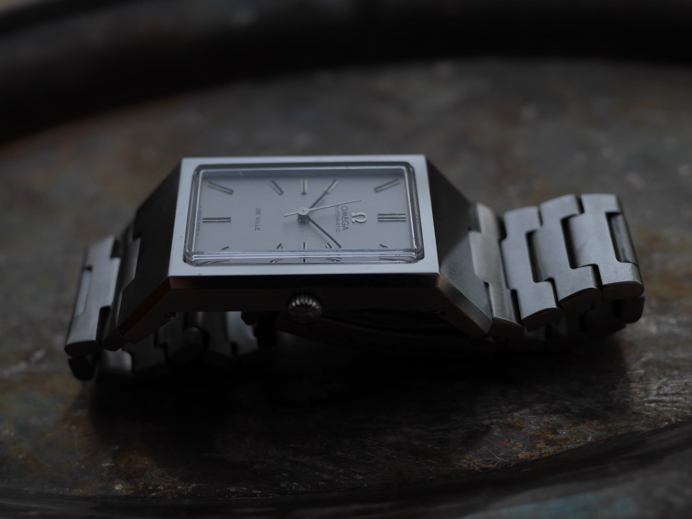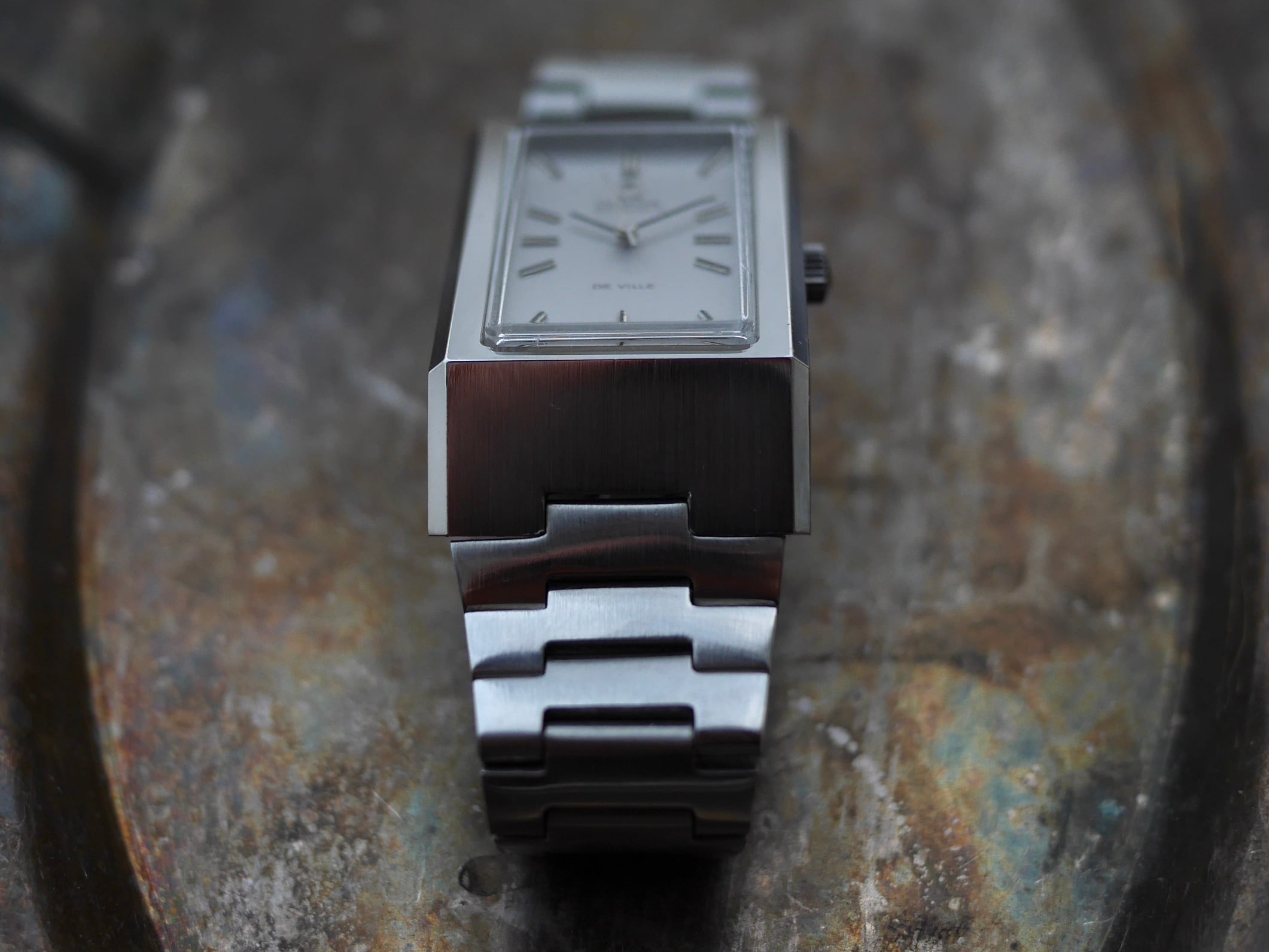 薄型のドレスウォッチとして1960年代に誕生したDe ville(デビル)が、70年代における腕時計変革期に変貌を遂げた新解釈の巨大なレクタンギュラータイプです。